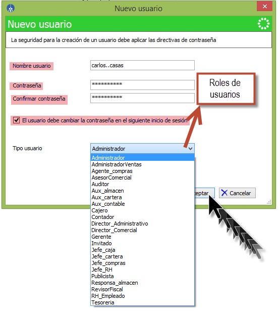 Tipo usuario: Se elige el rol del usuario que se está creando, el software trae unos permisos por defecto, sin embargo el administrador del sistema puede ajustar dichos permisos de acuerdo a las funciones del usuario.