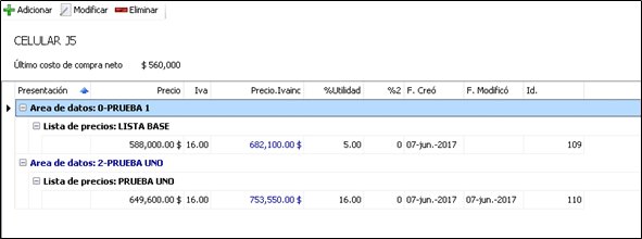 - Luego digite el producto a buscar y presione el botón adicionar, deberá seleccionar el área de datos en la cual creará el precio.