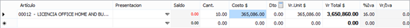 La información del costo que se digita en esta casilla sirve de manera informativa al momento de elaborar una Factura de compra/ causación de servicios para consultar el último costo al cual se adquirió el artículo y para realizar el cálculo del precio de venta basado en un porcentaje de utilidad. El costo especificado en esta sección NO tiene IVA.