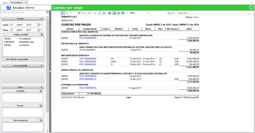 Sirve para generar un informe de los proveedores y los saldos que aún se le adeudan, diríjase a Informes/ Cuentas por pagar. Puede escoger entre revisar información detallada de un proveedor a través de la opción Consultas proveedores o revisar un saldo general con la opción Informe cuentas por pagar.