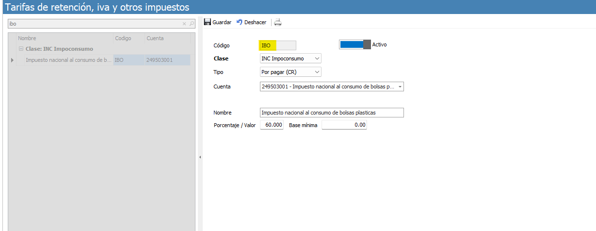 3. Diríjase a catálogos/Impuestos/retenciones y otros impuestos. Allí debe crear la tarifa correspondiente, la cual deberá tener como código "IBO". En clase deberá seleccionar "INCImpoconsumo"; seleccionará tipo "por pagar", en porcentaje o valor agregará "60" o el valor que determinen cobrar en la empresa. *Se recomienda validar si es posible cobrar más de 60 pesos por dicho impuesto. Una vez haya completado toda la información solicitada por el cuadro de diálogo deberá dar clic en "Guardar".