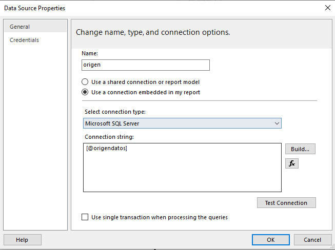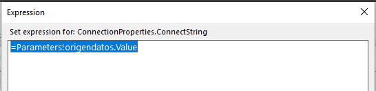 10. Vaya nuevamente a Data sources y haga doble clic sobre origen y haga clic en Fx y escriba =Parameters!origendatos.Value,